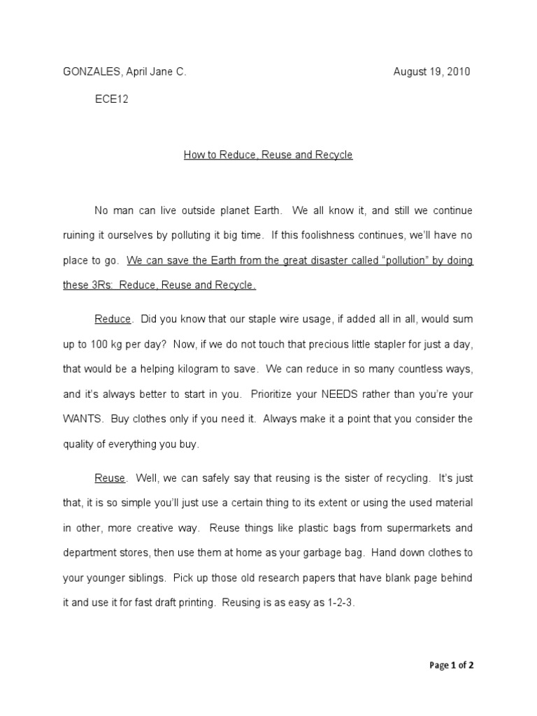 Stirring Essay On Reduce Reuse Recycle Thatsnotus
