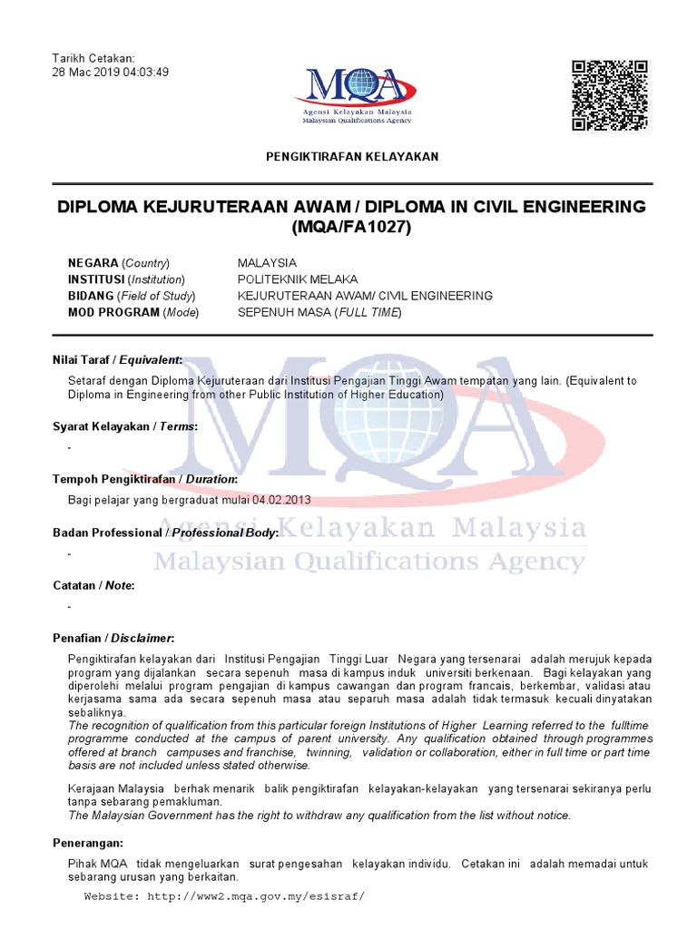 Diploma Kejuruteraan Awam Diploma In Civil Engineering Mqa Fa1027